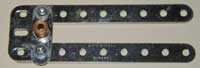 Reihenfolge: Pivot-Schraube, Unterlegscheibe (M4), Kettenrad, Unterlegscheibe (MECCANO), Stellring, rundes Loch des doppelreihigen 1 1/2"-Flachbandes, 4 1/2"-Flachband, Mutter. |